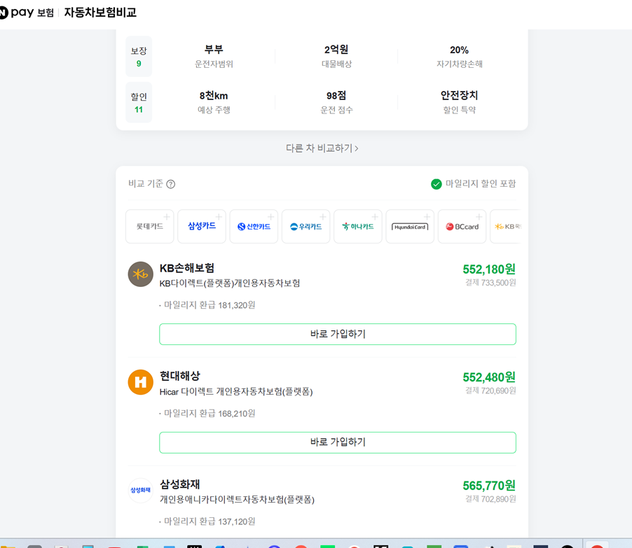 같은 조건이라도 보험사마다 보험료가 다르므로, 비교 사이트를 활용해 가장 경제적인 상품을 선택하세요. 제 경우는 네이버페이의 보험사별 비교견적을 이용했고 아래와 같은 결과를 얻었습니다.